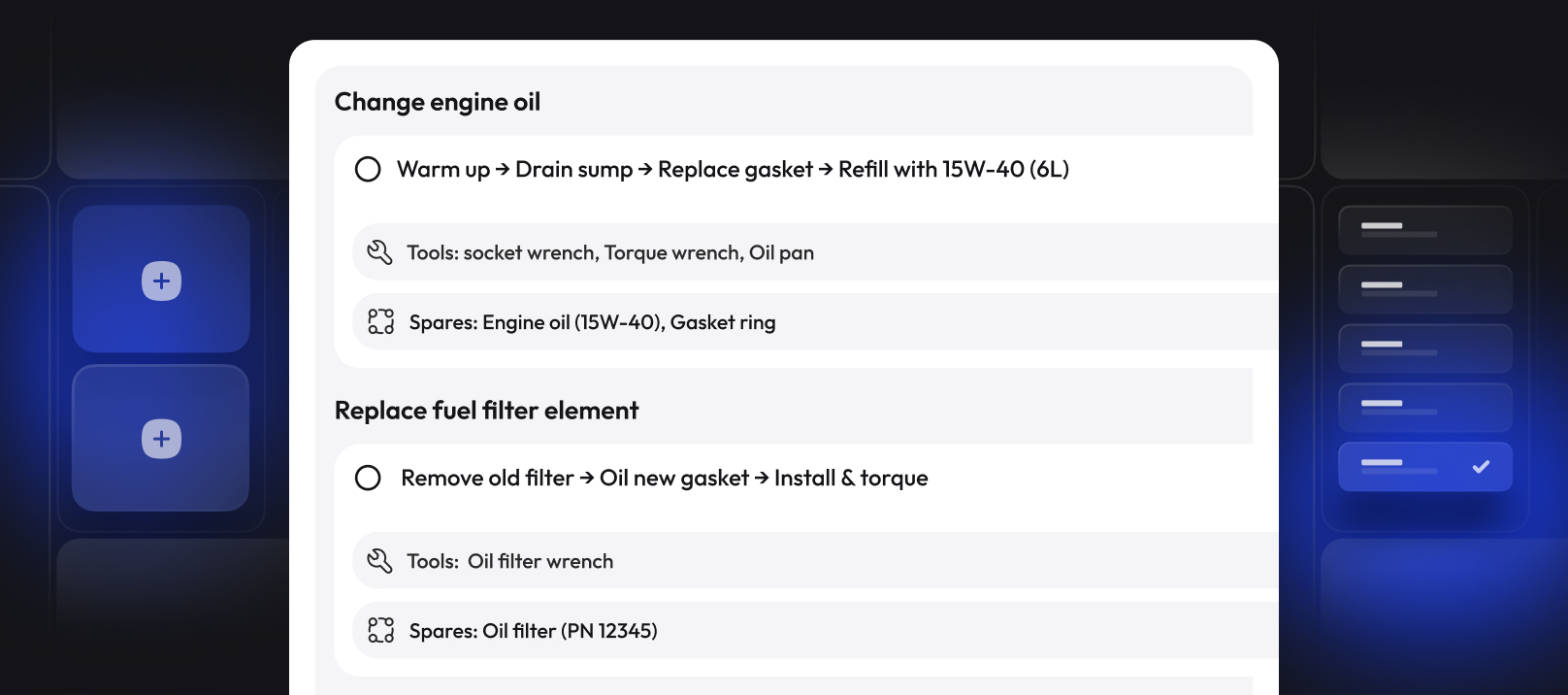 Clear, step by step guidance based on manufactures data and recommendations provide instruction and assistance, minimising downtime and returning equipment to operation sooner.