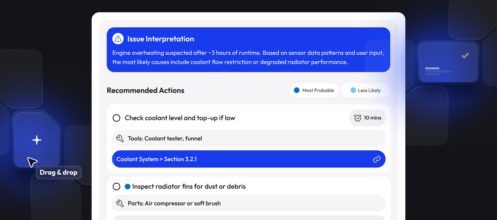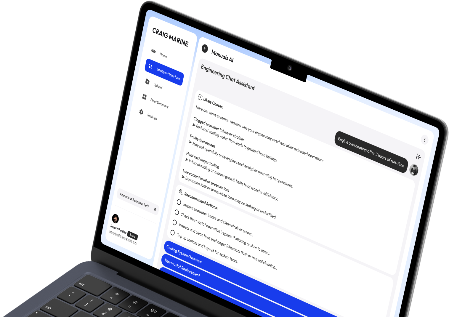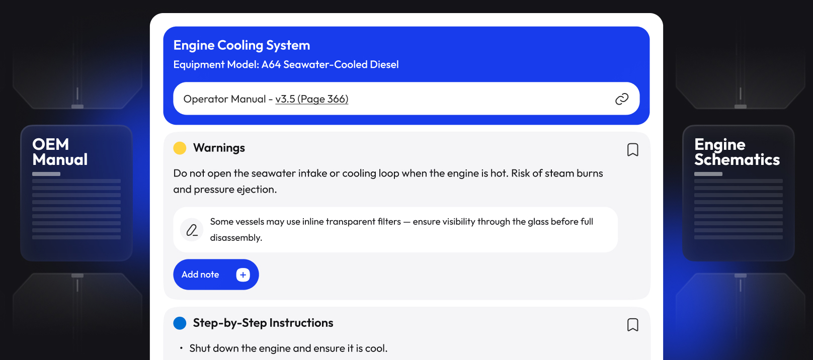 AI ingests and structures OEM manuals and schematics, creating a vessel-specific, searchable knowledge base calibrated for engineers and onboard equipment.